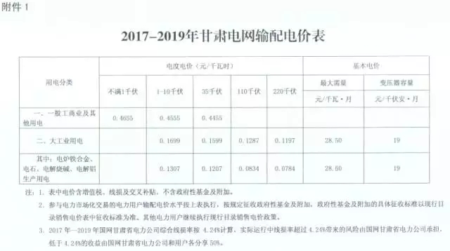 2017-2019年監管周期內甘肅電網分類別分電壓等級輸配電價標準詳見附件1。輸配電價改革降價空間用于降低省內大工業用電和一般工商業用電價格。