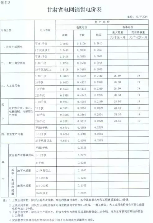 2、甘肅省電網銷售電價表