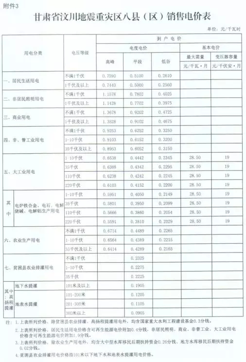 3、甘肅省汶川地震重災區八縣(區)銷售電價表