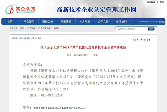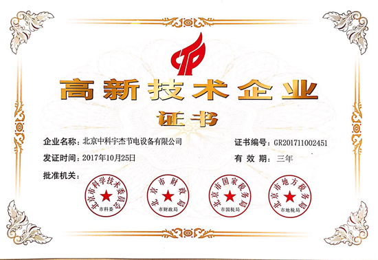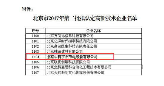 近日,國家高新技術企業認定管理工作網發布了《關于公示豐臺園2017年第二批擬認定高新技術企業名單的通知》,北京中科宇杰節電設備有限公司通過認證,榮獲“國家高新技術企業”的殊榮。