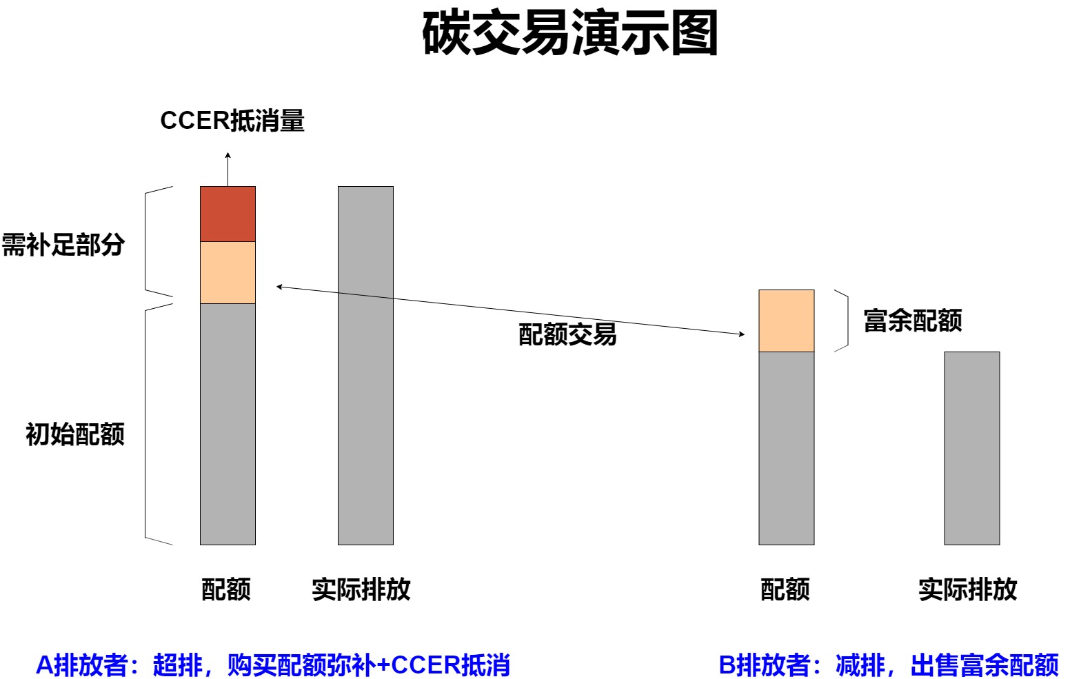 CCER同樣可用于企業碳排放抵減。參與碳交易市場的企業,會有每年的排放配額,減排能力強的還可以申請自愿減排量(CCER),加入碳交易市場,則可以交易富裕的配額和CCER,相當于是減排完成度差的企業向減排完成度好的企業進行“經濟補償”。