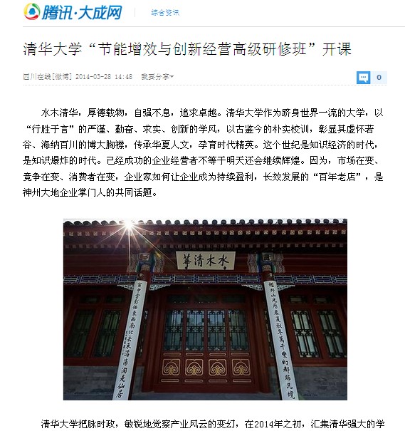 ????? 水木清華,厚德載物,自強不息,追求卓越。清華大學作為躋身世界一流的大學,以“行勝于言”的嚴謹、勤奮、求實、創新的學風,以古鑒今的樸實校訓,彰顯其 虛懷若谷、海納百川的博大胸襟,傳承華夏人文,孕育時代精英。這個世紀是知識經濟的時代,是知識爆炸的時代。已經成功的企業經營者不等于明天還會繼續輝 煌。因為,市場在變、競爭在變、消費者在變,企業家如何讓企業成為持續盈利,長效發展的“百年老店”,是神州大地企業掌門人的共同話題。