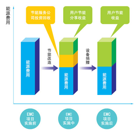 EMC 為客戶提供能源系統診斷、節能項目可行性分析、節能項目設計,幫助項目融資,選擇并采購設備、安裝調試、進行項目管理、培訓操作人員、合同期內系統設備維 護、節能量監測等一條龍服務,然后與客戶共同驗證項目的節能效果、環境效益與經濟效益,最后,與客戶分享項目實施后取得的經濟效益,回收項目的投資和獲得 應有的利潤。